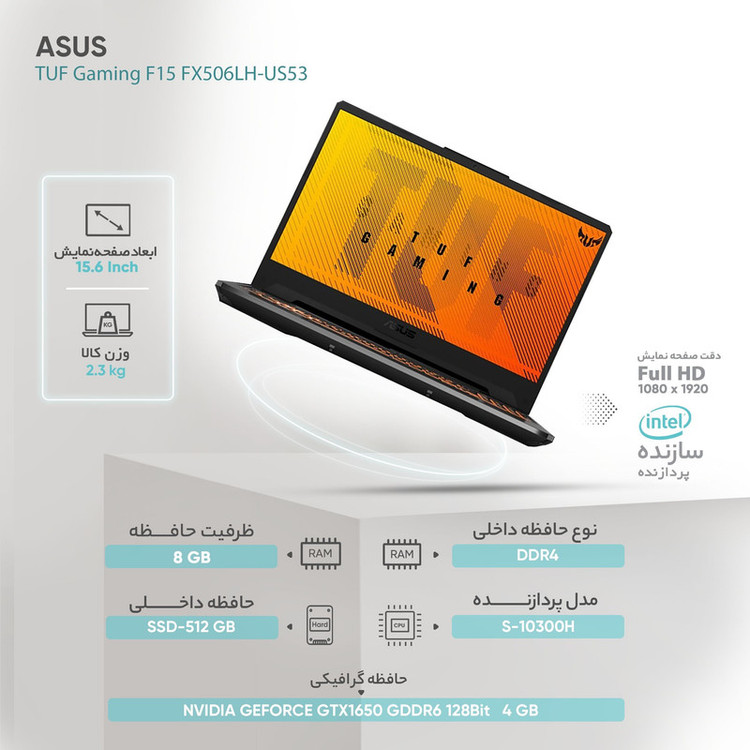 سری TUF لپتاپهای ایسوس تا به امروز توانستهاند با بهره بردن از مشخصات فنی مناسب، عملکرد بسیار خوب و قابلقبولی داشته باشند. در میان محصولات این سری، ایسوس سعی داشته تا برخی از لپتاپها را با قیمتهای اقتصادیتری روانه بازار کند. TUF Gaming F15 FX506LH-US53 یکی از لپتاپهای مقرونبهصرفه این شرکت است که از مشخصات فنی مناسب و قابل قبولی بهره برده است. این لپتاپ دارای وزن 2.3 کیلوگرم و ضخامت 2.4 سانتیمتر است. صفحهنمایش 15.6 اینچی این لپتاپ با رزولوشن 1080×1920 پیکسل، توانایی ارائه نرخ بروزرسانی 60 هرتز را دارد. پردازنده بهکار رفته در این مدل سری Core i5 اینتل است. پردازنده گرافیکی این لپتاپ GEFORCE GTX1650 است که میتواند باعث توانایی ارائه عملکرد کاملا خوب و قابل قبولی شود. 8 گیگابایت حافظه رم از نوع DDR4 در کنار 512 گیگابایت حافظه داخلی از نوع SSD، از دیگر مشخصات فنی در نظر گرفته شده برای لپتاپ Gaming F15 FX506LH-US53 ایسوس است.